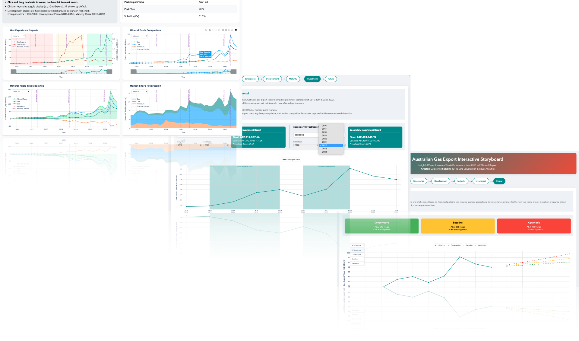 Crafted a comprehensive data visualisation suite analysing 37 years of Australian international trade data, focusing on gas export transformation. Engineered sophisticated statistical analysis framework incorporating growth rate, correlation matrices, structural break, and volatility across 78 categories, revealing Australia's evolution into a global LNG leader. Designed & deployed self contained dashboard & storyboard as web apps featuring advanced interactive controls, real time investment simulation capabilities, and policy oriented insights, successfully demonstrating 332× sectoral growth through compelling visual narratives targeted at government stakeholders and industry professionals / investors.