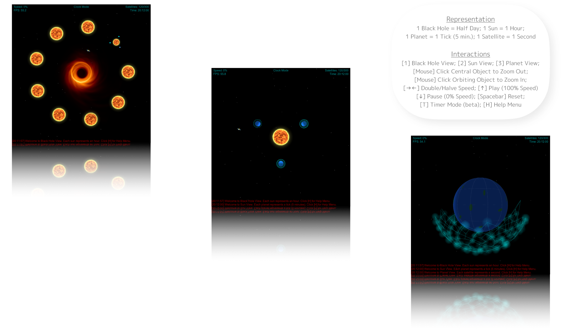 Multi scale temporal visualisation system reinterpreting celestial mechanics as functional time interfaces across three nested views: Black Hole centred view tracking 12 hour cycles like hour hand, Sun centred view marking 5 minute ticks like minute hand, and Planet centred view counting individual seconds like second hand of an analogue clock. The concept originated from Starlink's deployments patterns, translating constellation aesthetics into a clock system where astronomical observation replaces conventional numerals, supplemented by Time Machine (time travel to any timestamps) and Timer Mode (countdown with reverse mechanisms) as practical functions. Animation architecture employs graduated spreading algorithms producing organic repositioning behaviours.