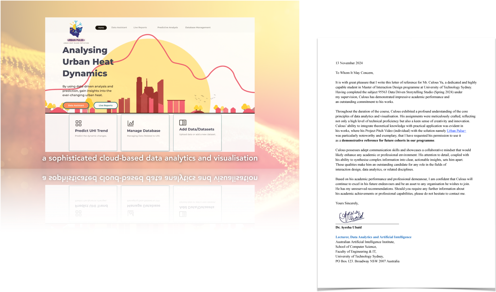 Led the development of an innovative solution addressing urban heat island (UHI) effects in New South Wales, Australia. This project, targeting the NSW Department of Planning and Environment, combined sophisticated data analytics with user centred design principles. The project pitch video received full marks and was requested by Australian AI Institute (AAII) lecturer as a reference for future cohorts.